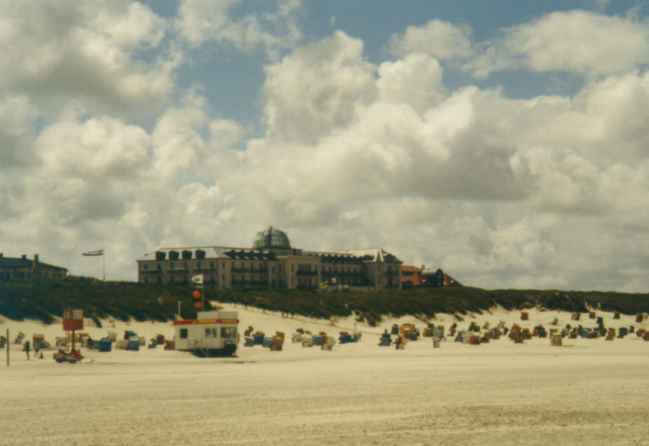 Ein vier Sterne Hotel mit einer riesigen Glaskuppel bestimmte das Bild von Juist vom Strand aus.