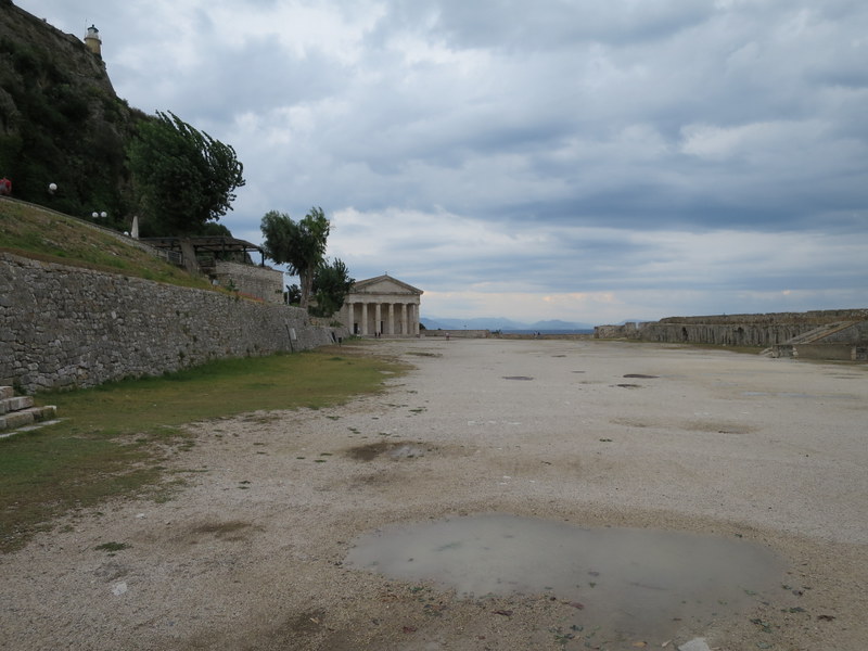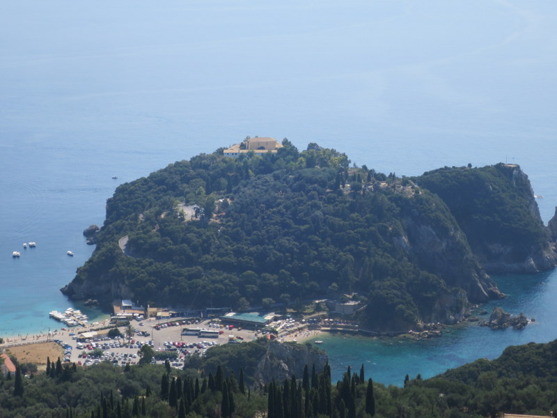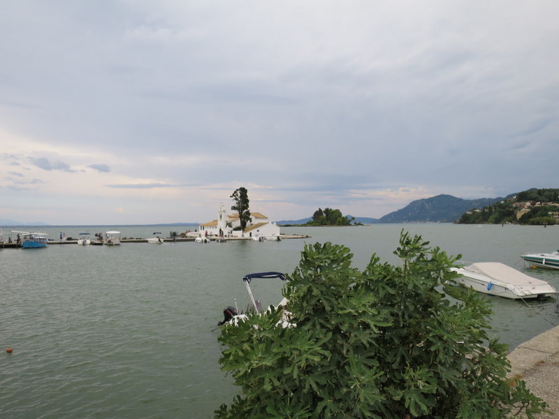 Auf der anderen Seite liegt eine kleine Insel mit einer Kirche die über einen weiteren Steg mit dem der Korfu Hauptinsel verbunden ist.