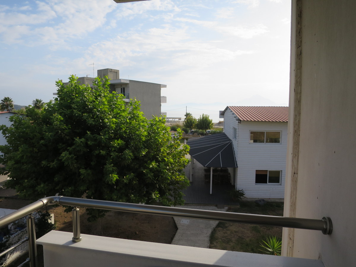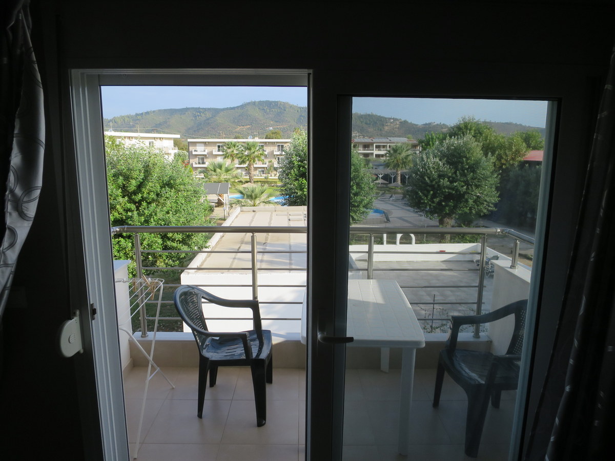 Blick aus dem Zimmer auf den Balkon und das Hotel |
